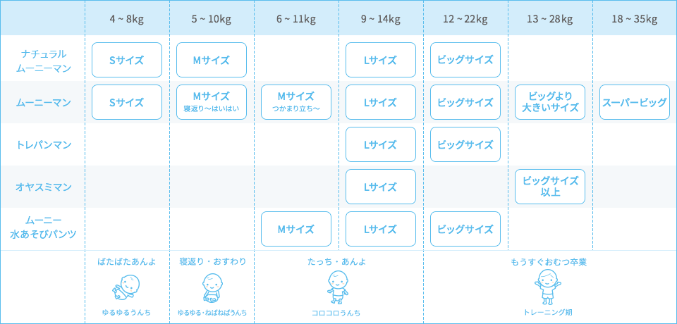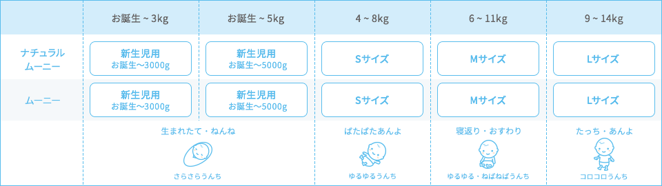 テープタイプもパンツタイプも、赤ちゃんのからだの発育状態に合わせて、いろいろなサイズがあります。