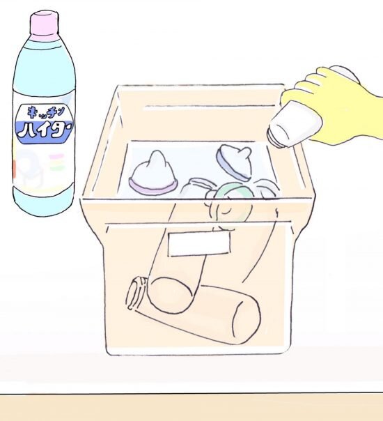 容器に台所用漂白剤のうすめ液をつくり(1Lの水に10ml)、分解した哺乳瓶を入れ、フタをします。規定の時間つけおきした後、水でよくすすいで自然乾燥させましょう。