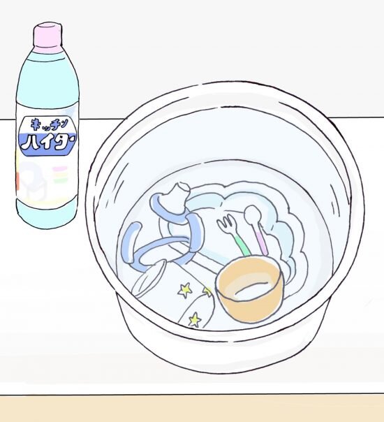 食器用洗剤で洗った後、洗い桶に台所用漂白剤のうすめ液をつくり(1Lの水に10ml)、ベビー用食器やマグを入れ、規定の時間つけおきした後、水でよくすすいで自然乾燥させましょう。