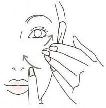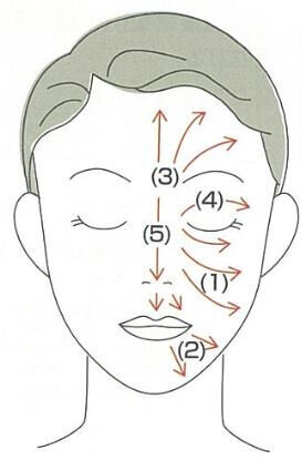 ②力を入れず顔の中心から外側へ、イラストのように筋肉の流れに沿って伸ばすときれいに仕上がります。