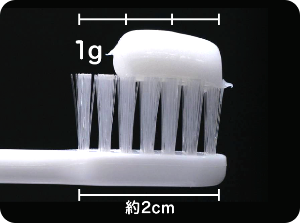 フッ素を歯に効果的に取り込ませるには、フッ素入りハミガキをハブラシに1g以上つけて、2分間ブラッシングするのがポイントです。また、フッ素はいったん歯に取り込まれても、口をすすぎすぎると溶け出してしまいます。すすぎの回数を少なめにすることも大切です。
