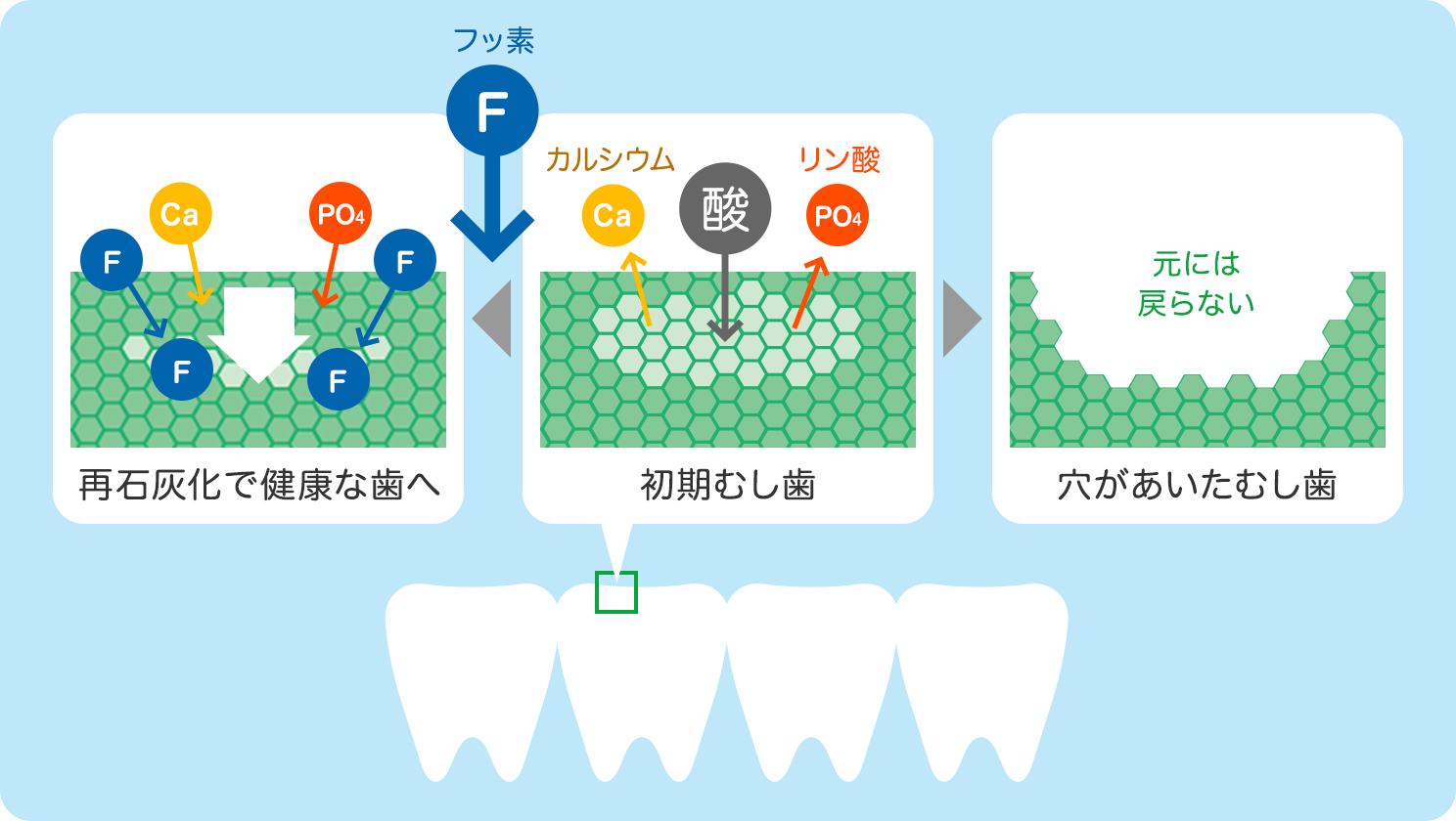 毎日のケアで、初期むし歯を健康な状態に戻し、むし歯を予防するには、どうすればよいのでしょうか。ここで重要な役割を果たすのが、フッ素入りハミガキです。フッ素には、歯へのミネラルの補給を促し、健康な状態にもどす(再石灰化)働きがあります。また、フッ素で再石灰化を促した歯は、酸に強くなるため、むし歯になりにくくなります。