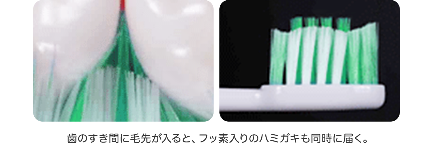 フッ素入りハミガキの効果をさらに高めるには、みがき方にもコツがあります。歯のみぞや歯と歯の間などに、ハブラシの毛先が入ると、フッ素入りハミガキも同時に届き、むし歯予防効果が高まります(LFD法:Local Fluoride Delivery<フッ化物局所送達>)。フロス機能のついたハブラシなどを使って、すき間を意識した歯みがきを心がけてください。