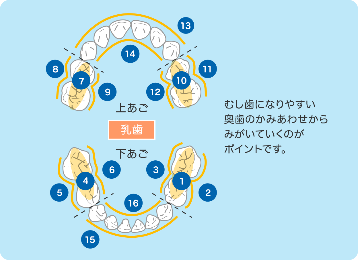 歯をみがく順番を決めて、口の中全体をまんべんなくみがきます。まずは、むし歯になりやすい奥歯から。歯1本1本をていねいにみがくことを心がけましょう。