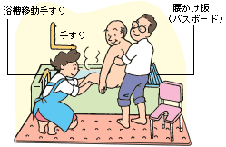 台やバスボードを使って マヒのある場合は、台や板に腰掛けたかたちからマヒのない側の足を先に浴槽へ。介護をする人は背中を支えながら、もう一方の手でマヒ側の足を持ち上げましょう。