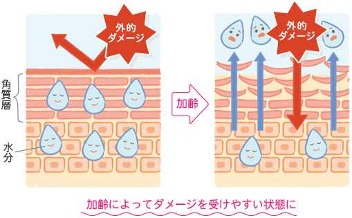 私たちの肌の表層は角質層で覆われています。角質層は角化した皮膚の細胞が積み重なった構造をしており、肌に潤いを閉じ込め、肌の深層への刺激を防ぐバリア機能を担っています。年齢を重ねると、この角質層の構造が乱れて肌のバリア機能が低下しがちになります。 このため、加齢に伴って肌の潤いが失われやすく、さまざまな外的ダメージを受けやすくなるのです。また、年齢を重ねるごとに肌に広く分布する皮脂腺や汗腺の機能も低下するため、肌の潤いはさらに失われて、ますます角質層の構造が乱れやすくなるのです。