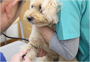 目や耳に異常はないか、歯石が溜まっていないか、脇や首、ひざの関節のリンパ節が腫れていないかなど、直接手で触れて確認。続いて聴診器を当てて心臓の音を聞きます。