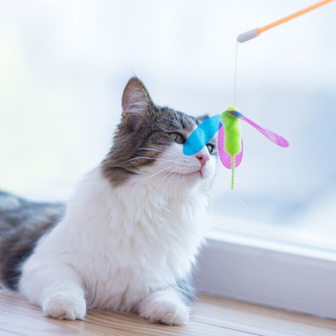 例えば、知育玩具の中にフードを入れて転がしたり、猫じゃらしなどで小鳥や昆虫のように空中で動かしたり、ネズミが地面を這うように動かしたりするなど、「ハンター」心を刺激する遊びで、猫ちゃんが活発に動くように工夫してみてください。さらに、室内飼いの猫ちゃんには、窓から外の景色を見せることも良い刺激になります。