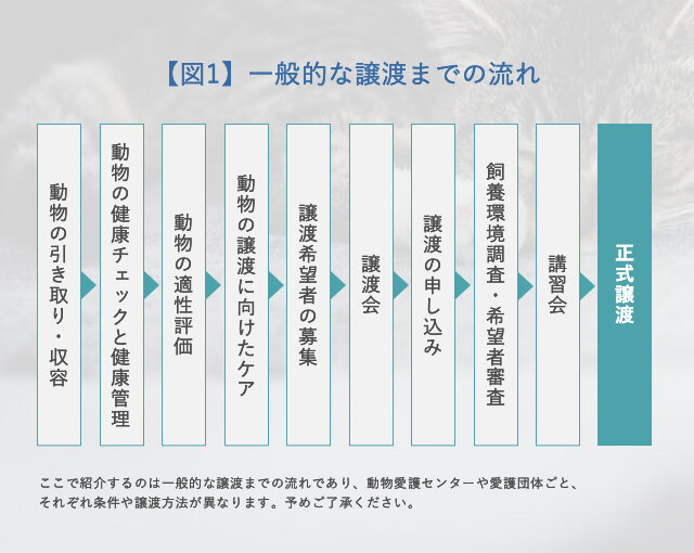 譲渡の流れは、動物愛護センターや愛護団体によって、内容が多少異なりますが、大きな流れの例が図1です。保護施設で譲渡適性が認められた犬や猫は、新しい飼い主の募集をします。その情報はホームページなどに掲載され、譲渡会などで対面。そこで希望する犬や猫がいた場合、譲渡の申し込みをしますが、希望者のライフスタイルと動物の性格や気質とのマッチングや、飼育環境などの調査があり、そこで断られる場合もあります。審査をパスすると、犬や猫を適正に飼うための講習会に参加後、正式譲渡となり、犬や猫をうちの子として迎えることができます。