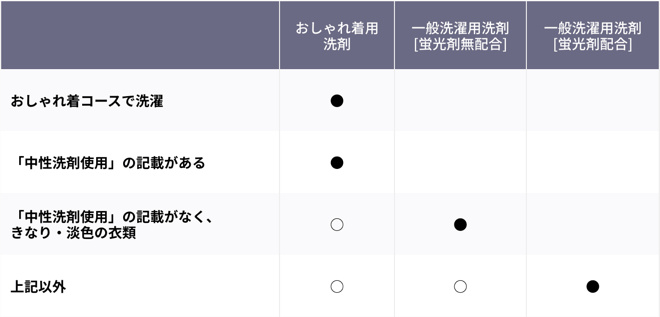使用する洗剤は、洗濯表示や、記号の近くに記載される「中性洗剤使用」などの言葉、衣類の色を確認し、決定しましょう。
