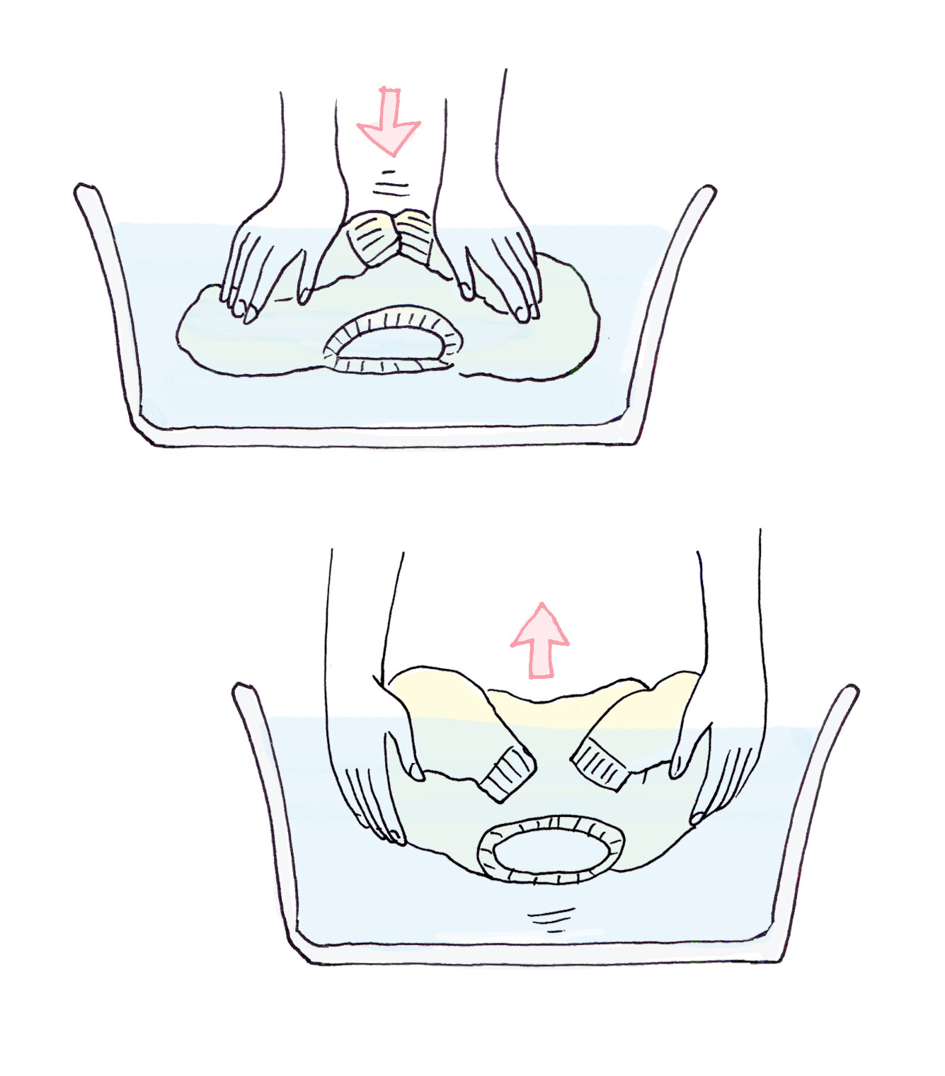 4.洗い桶の中で、汚れている部分を指先でつまんでこすって洗う