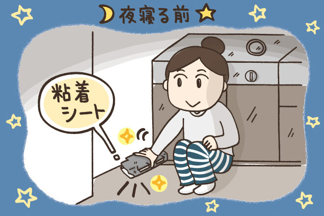 夜行性のゴキブリは、23~24時になると活動を開始するので、夜寝る前にキッチン、お風呂、洗面所にできるだけたくさん粘着シートを置いておきます。このとき、流しの戸は開けておいてください。 朝起きて、ゴキブリが取れていたら、そこがゴキブリの歩く道。翌日からは、その道に重点的に粘着シートを置くようにします。2~3日目からは取れる数が増えます。