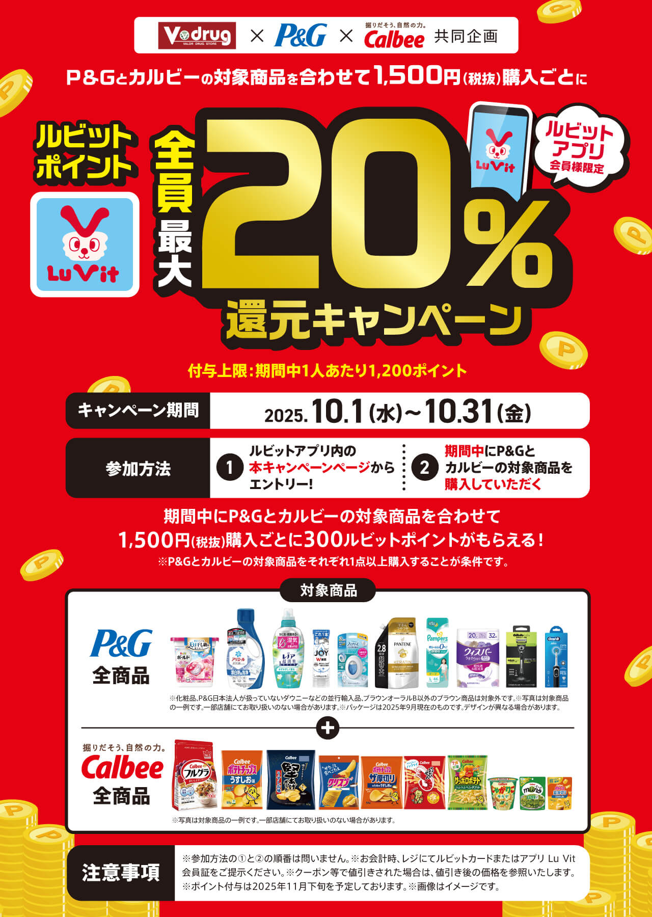 P&Gとカルビーの対象商品を累計1,500円(税抜)以上、購入。 1,500円(税抜)ごとに「300ルビットポイント」を進呈。