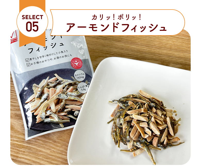 国内産のカタクチイワシに、甘辛い味付けとごまをからませました。交互に感じるアーモンドと小魚の食感が絶妙。おいしくカルシウムも摂取できます♪