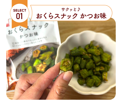 減圧低温フライ製法でサクッとした軽い食感!なのにおくら独特のネバネバも楽しめる不思議なスナック。かつお節の旨みたっぷり、やさしい味わいです。