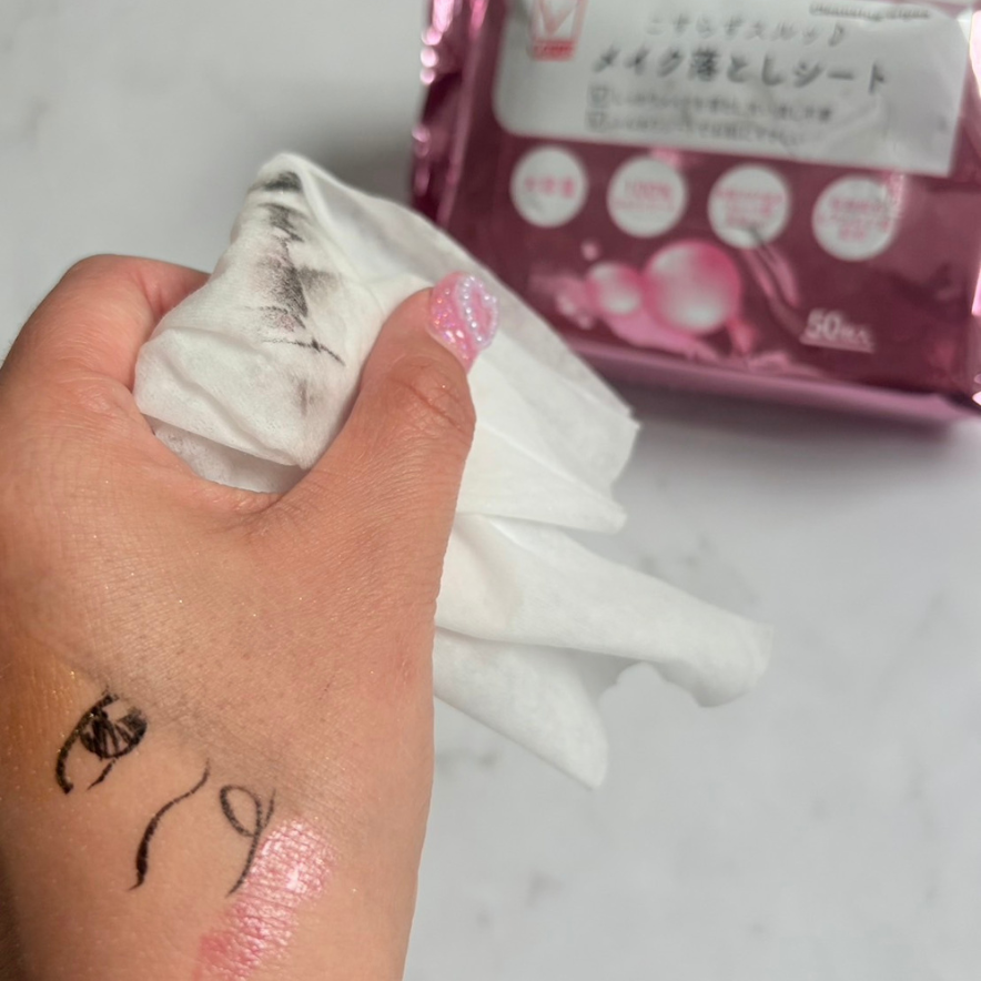 少し馴染ませてから拭き取るとリップやグリッターでもするんと落ちました! そして何より顔と同じくらいの大判サイズなので折りたたんでいろんな面を使うことができます!